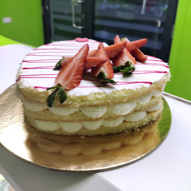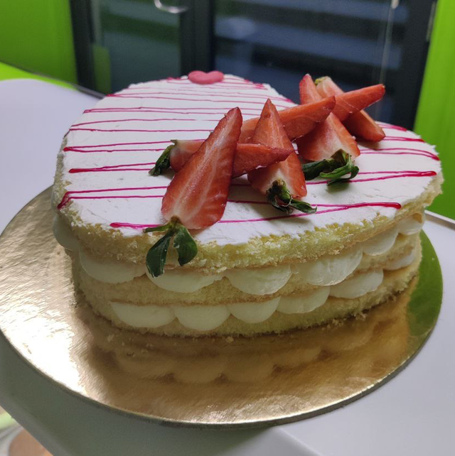 Torta pan di spagna farcita con cream cheese e decorata con fragole fresche.
